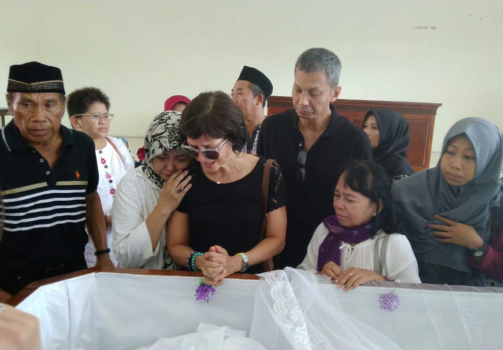 Hujan tangis dan raut duka pecah saat Marie Claire Lintang, putri almarhum tiba.