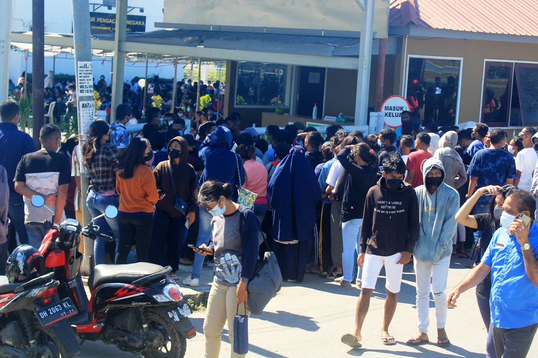 SEKITAR 2.000 orang merobohkan pintu gerbang Gedung Jurusan Farmasi, Poltekes Kemenkes Kupang, NTT, Rabu (14/7) pagi gara-gara terlalu lama menunggu untuk menerima vaksin covid-19.