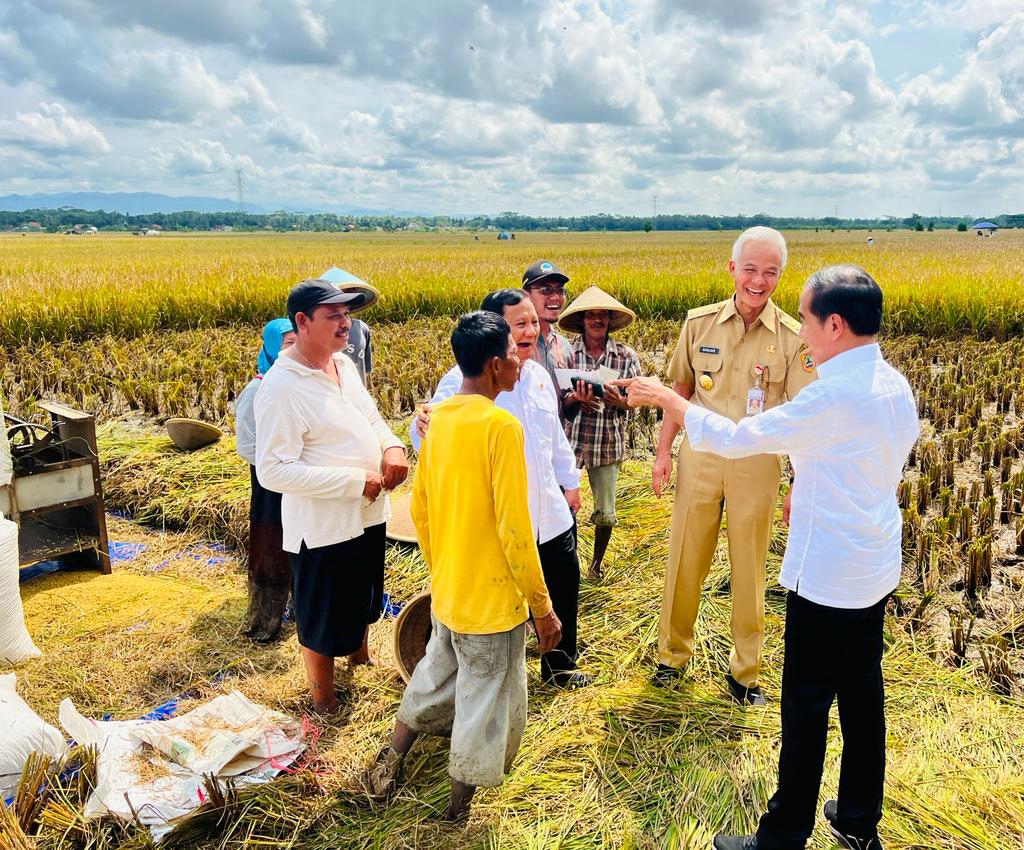 "Saya lihat juga bagus hasil panennya. Satu hektare bisa di atas 5 ton. Ini bibit hibrida Inpari 32 hasilnya bagus."