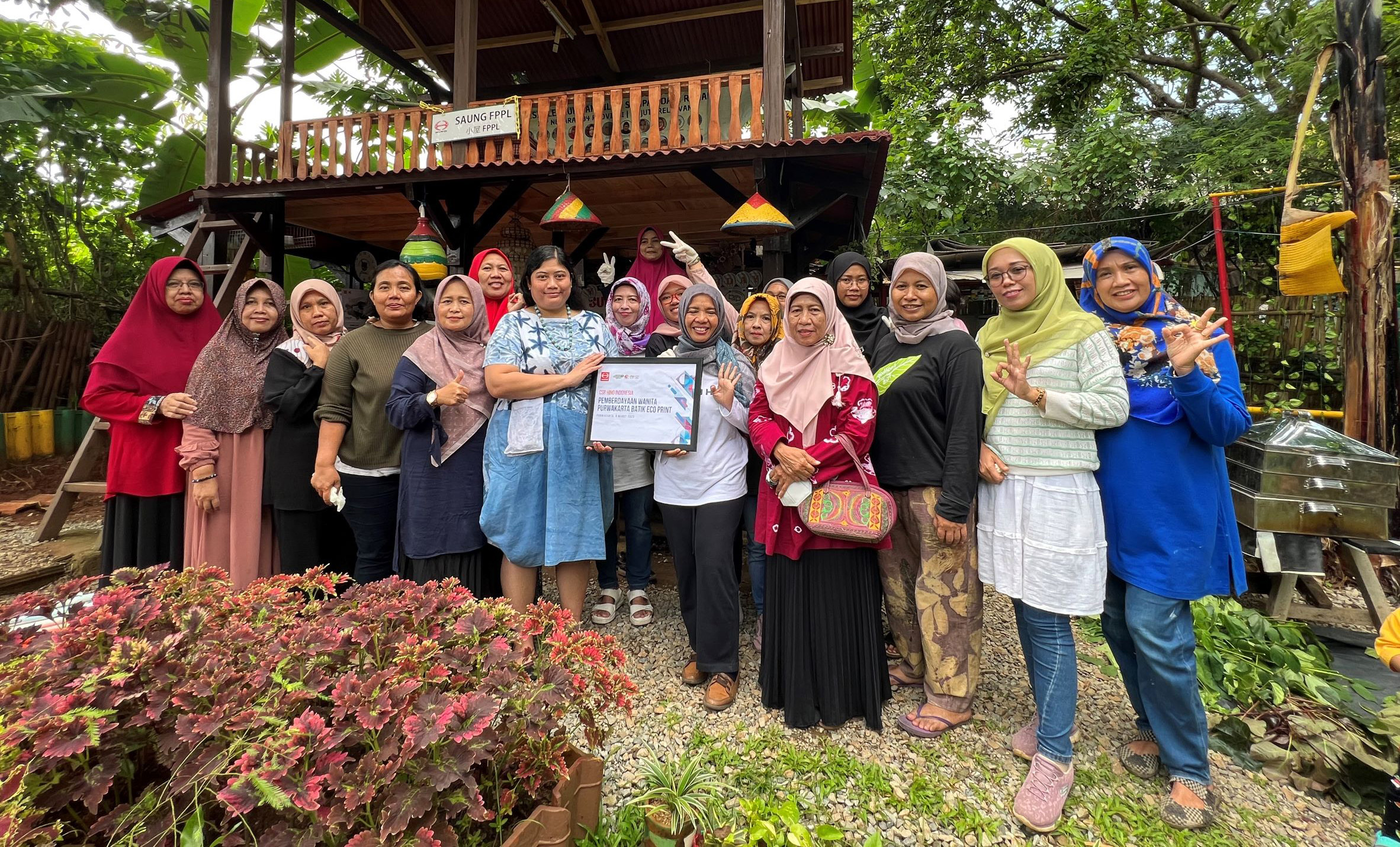 Para peserta diberikan pelatihan tehnik cetak dengan pewarnaan kain alami dengan memanfaatkan daun yang ada di sekitar kebun untuk menghasilkan motif yang unik dan otentik.