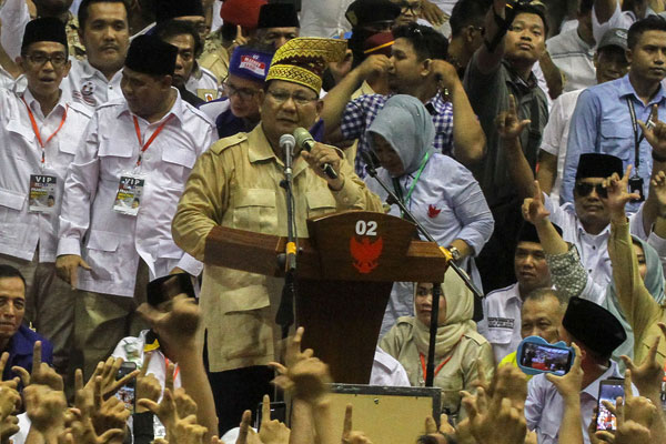 Prabowo hanya meminta para pendukungnya untuk tidak lengah melihat hasil lembaga survei yang cenderung mengunggulkan paslon nomor urut 01.