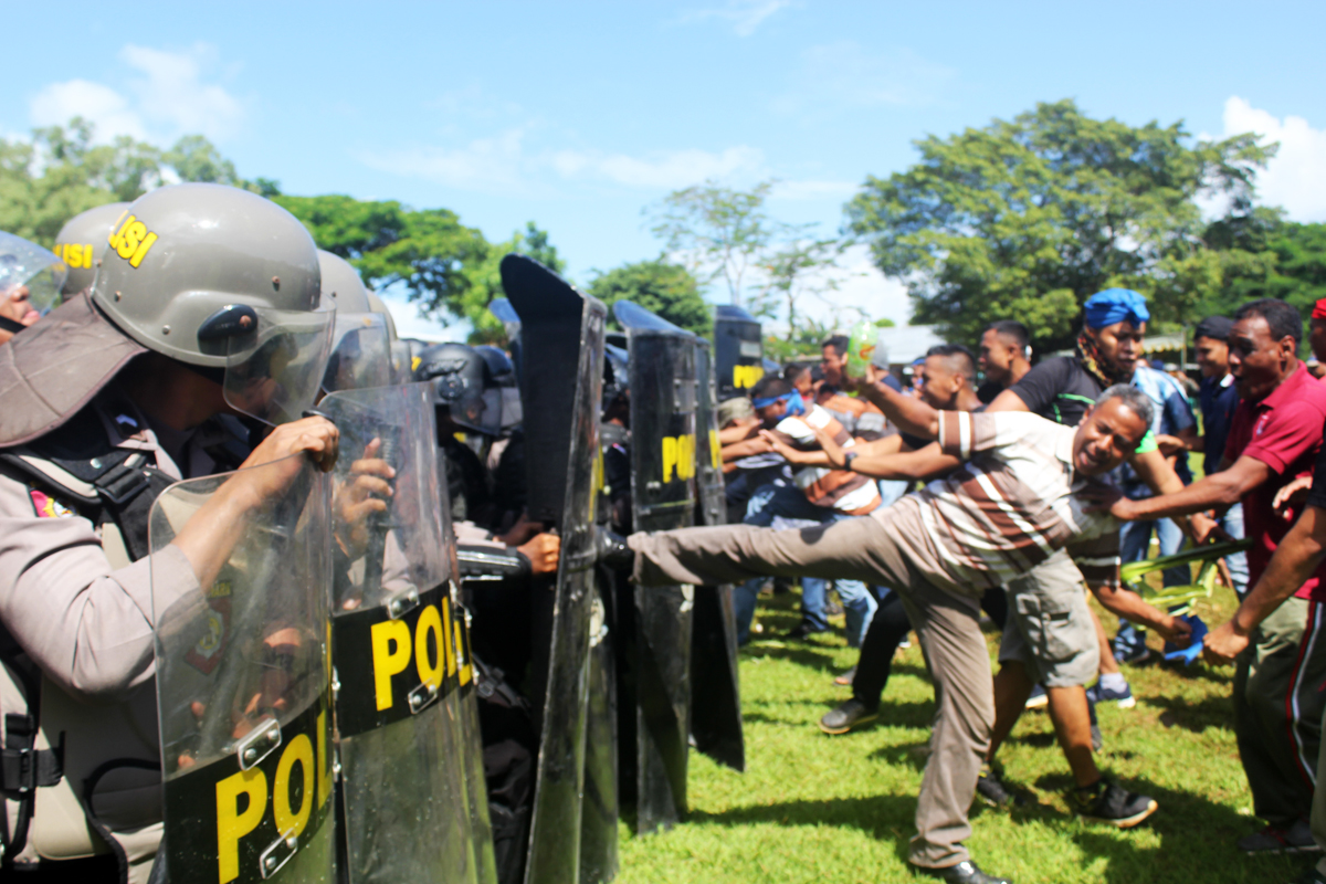 Teriakan dari massa yang telah menyemut itu, terdengar cukup memekakkan telinga. Di lokasi itu pun terlihat barikade petugas gabungan TNI-Polri lengkap dengan alat perangnya.