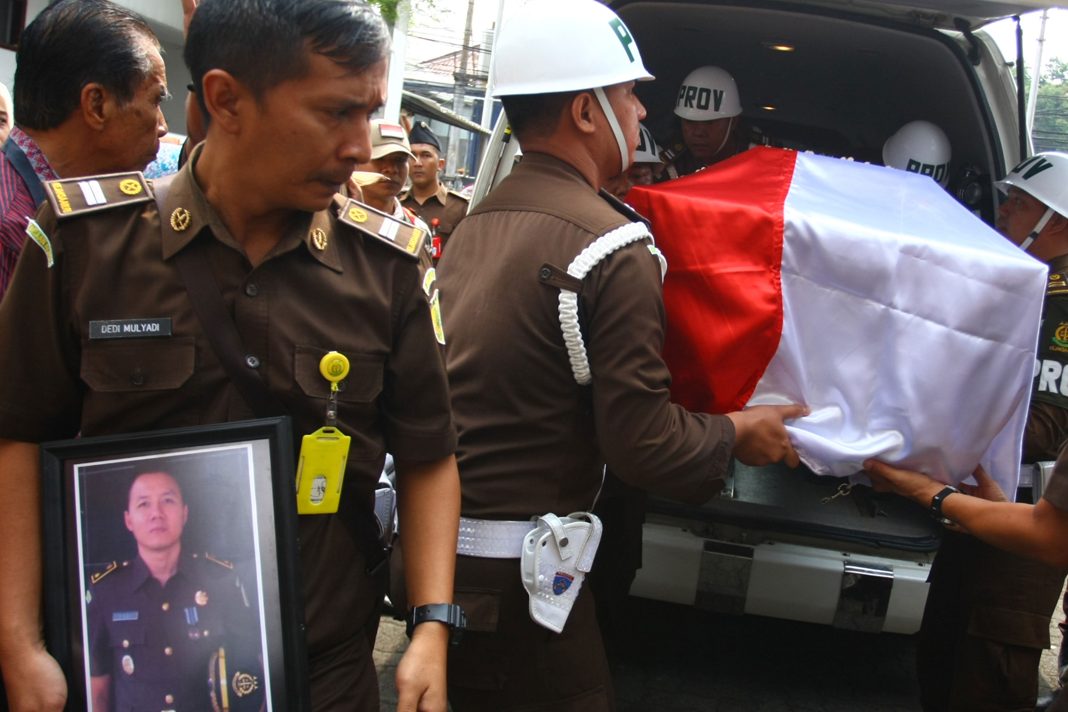 Jenazah almarhum Dodi Junaidi yang telah teridentifikasi oleh Rumah Sakit Polri Kramat Jati Jakarta Timur, disemayamkan di Masjid Baitul Adli Kejaksaan Agung.