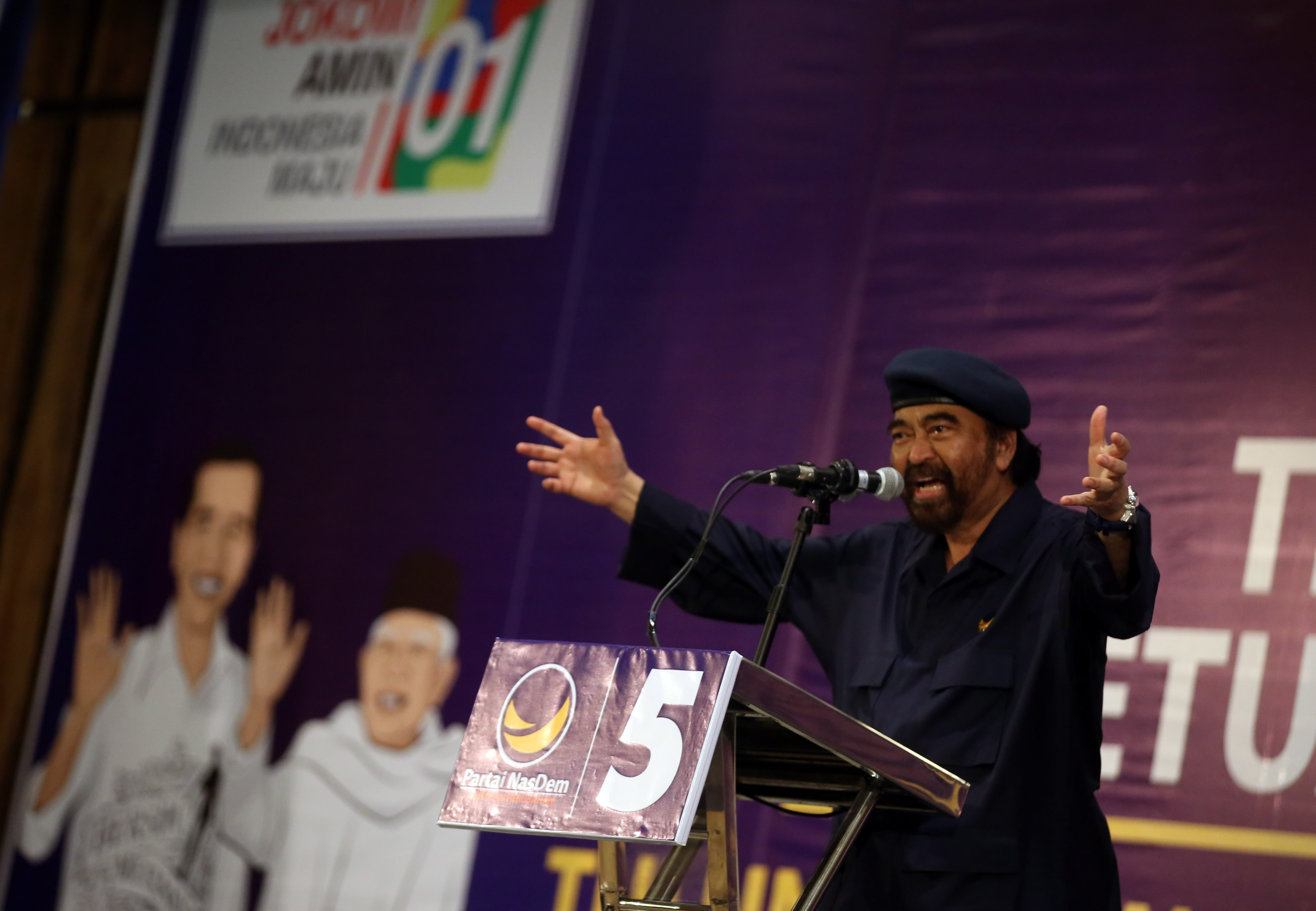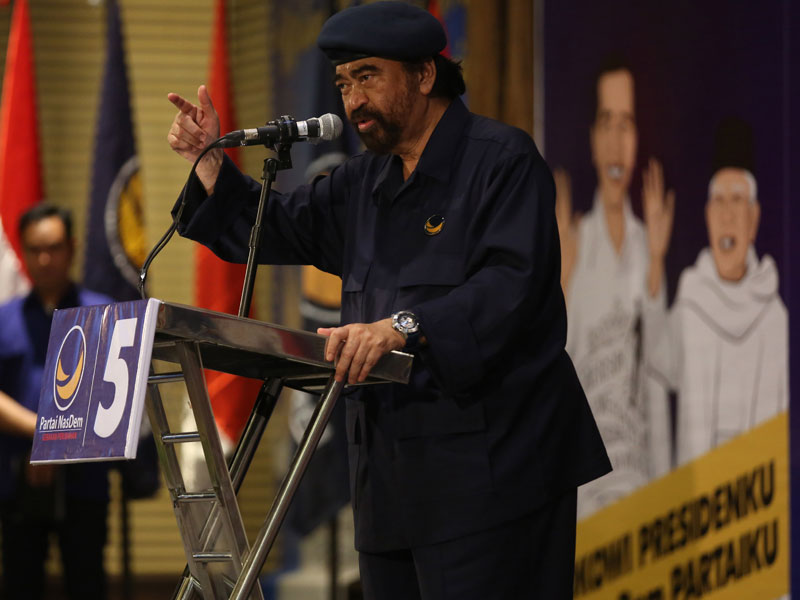 Tampil dengan setelan seragam resmi partai warna biru gelap, Surya Paloh berorasi tentang arah gerak dan target Partai NasDem di Pemilu 2019.