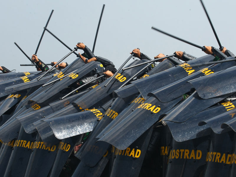 Teriakan dari massa yang telah menyemut itu, terdengar cukup memekakkan telinga. Di lokasi itu pun terlihat barikade petugas gabungan TNI-Polri lengkap dengan alat perangnya.