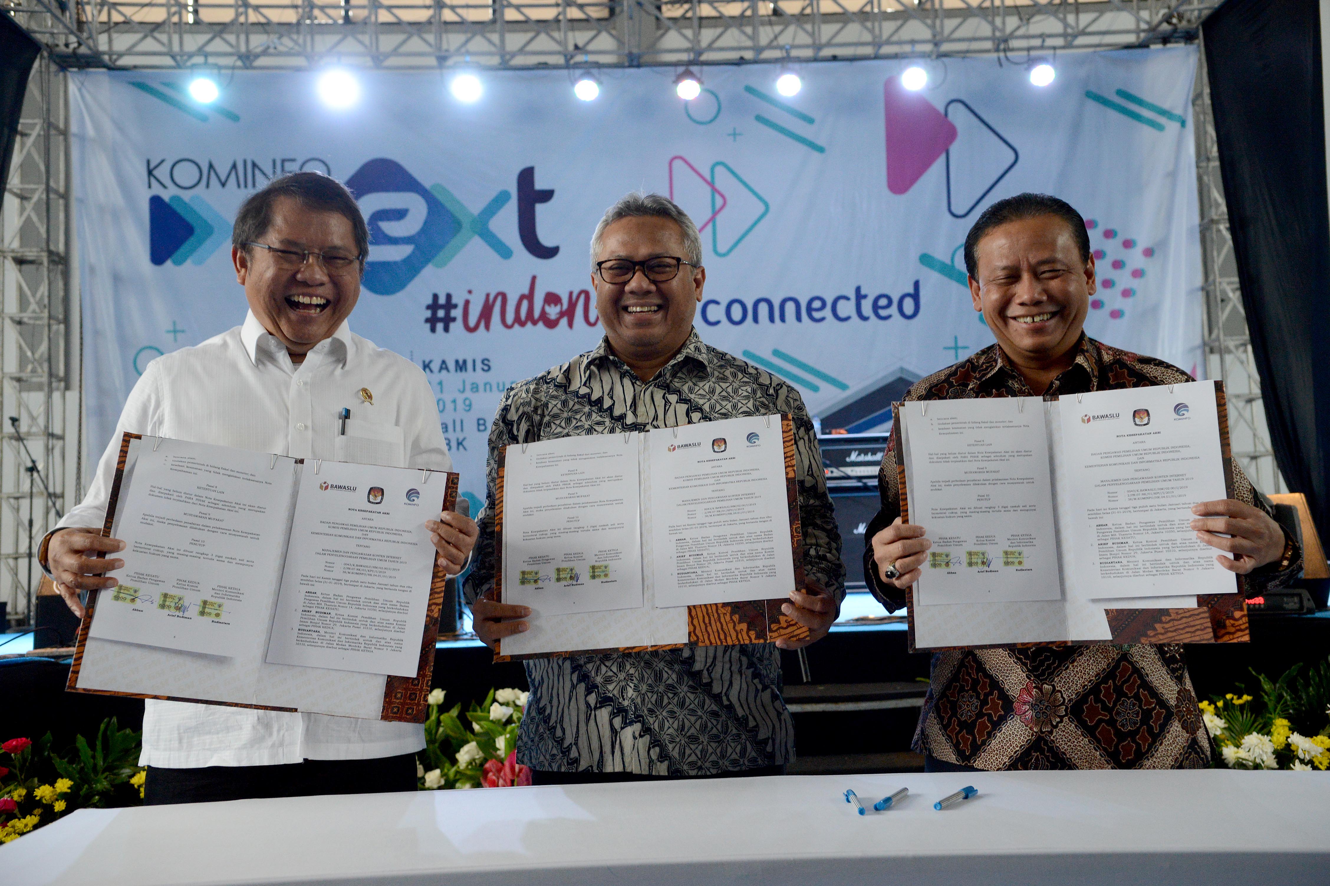 KEMENTERIAN Komunikasi dan Informatika, Bawaslu, dan KPU menandatangani nota aksi bersama pengawasan konten internet terkait dengan Pemilu 2019.