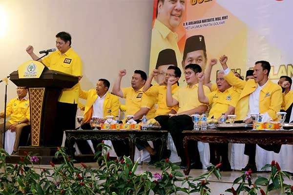 RIBUAN kader dan lembaga sayap Partai Golkar, serta alim ulama berkumpul menyambut kedatangan Ketua Umum Partai Golkar