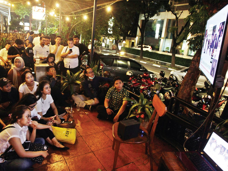 PENDUKUNG pasangan Joko Widodo-Ma'ruf Amin dan pasangan Prabowo Subianto-Sandiaga Uno menggelar nonton bareng (nobar) debat capres-cawapres di Jakarta, tadi malam.
