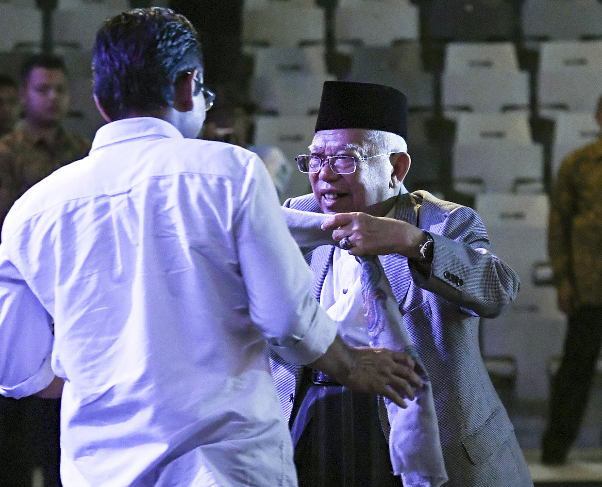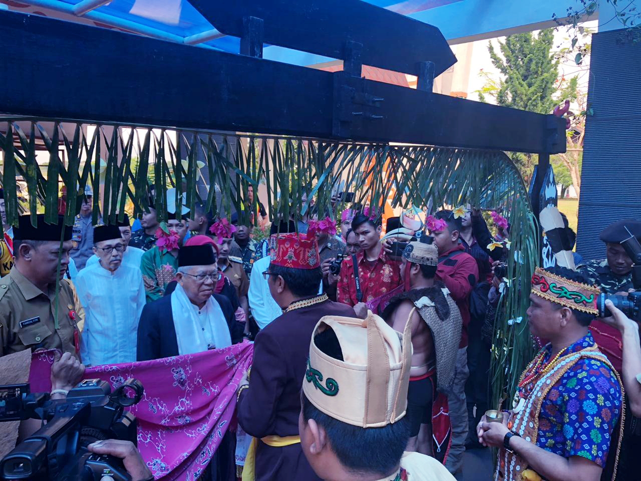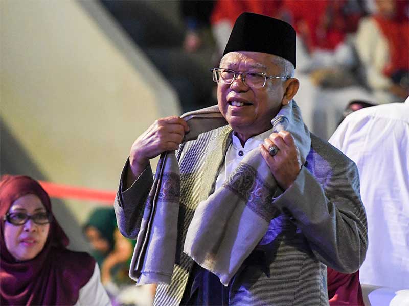 Ma'ruf hadir pukul 08.30 WIB dengan mengenakan baju muslim putih dan bawahan sarung krem dipadukan jas berwarna gelap, kopiah hitam dan sorban putih.