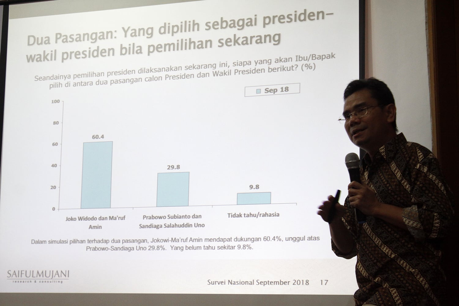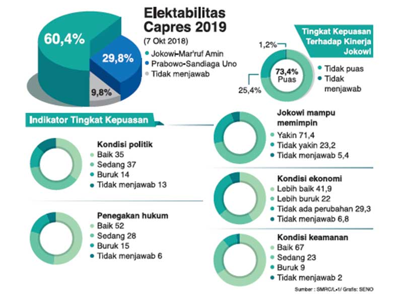 Hasil survei terbaru yang dirilis SMRC memperlihatkan pasangan Jokowi-Amin jauh mengungguli pasangan Prabowo-Sandi.