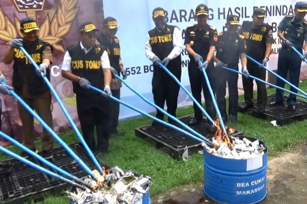Jajaran Kantor Bea dan Cukai Sulawesi Bagian Selatan, memusnahkan 12.543.000 batang rokok dan 552 botol minuman keras (Miras) ilegal berbagai merk, di Jalan Kapasa, Kecamatan Biringkanaya, Makassar, Sulawesi Selatan.