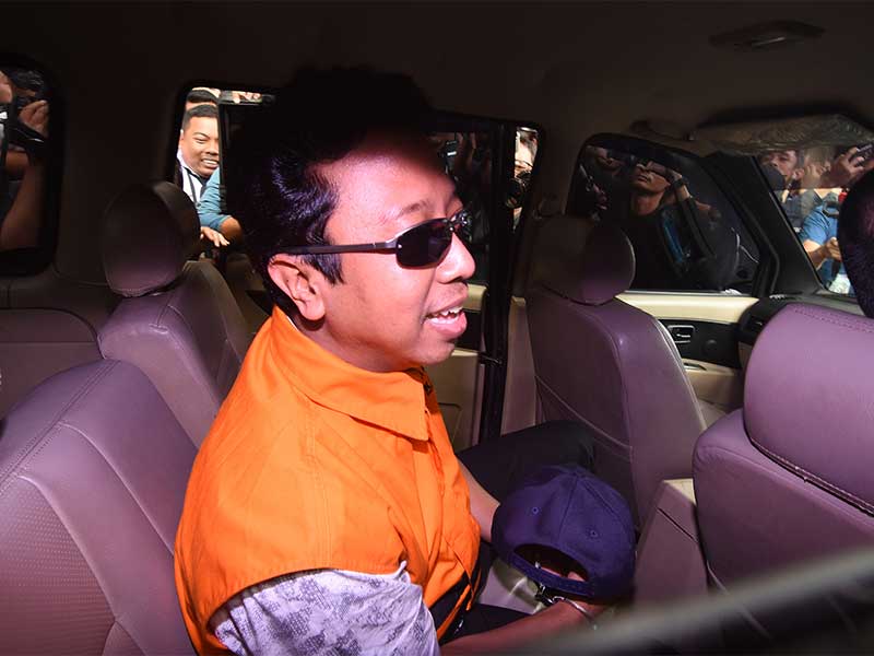 Romi keluar dari gedung KPK dengan mengenakan kacamata hitam dan rompi tahanan KPK pada Sabtu (16/3), sekitar pukul 11.45 WIB.