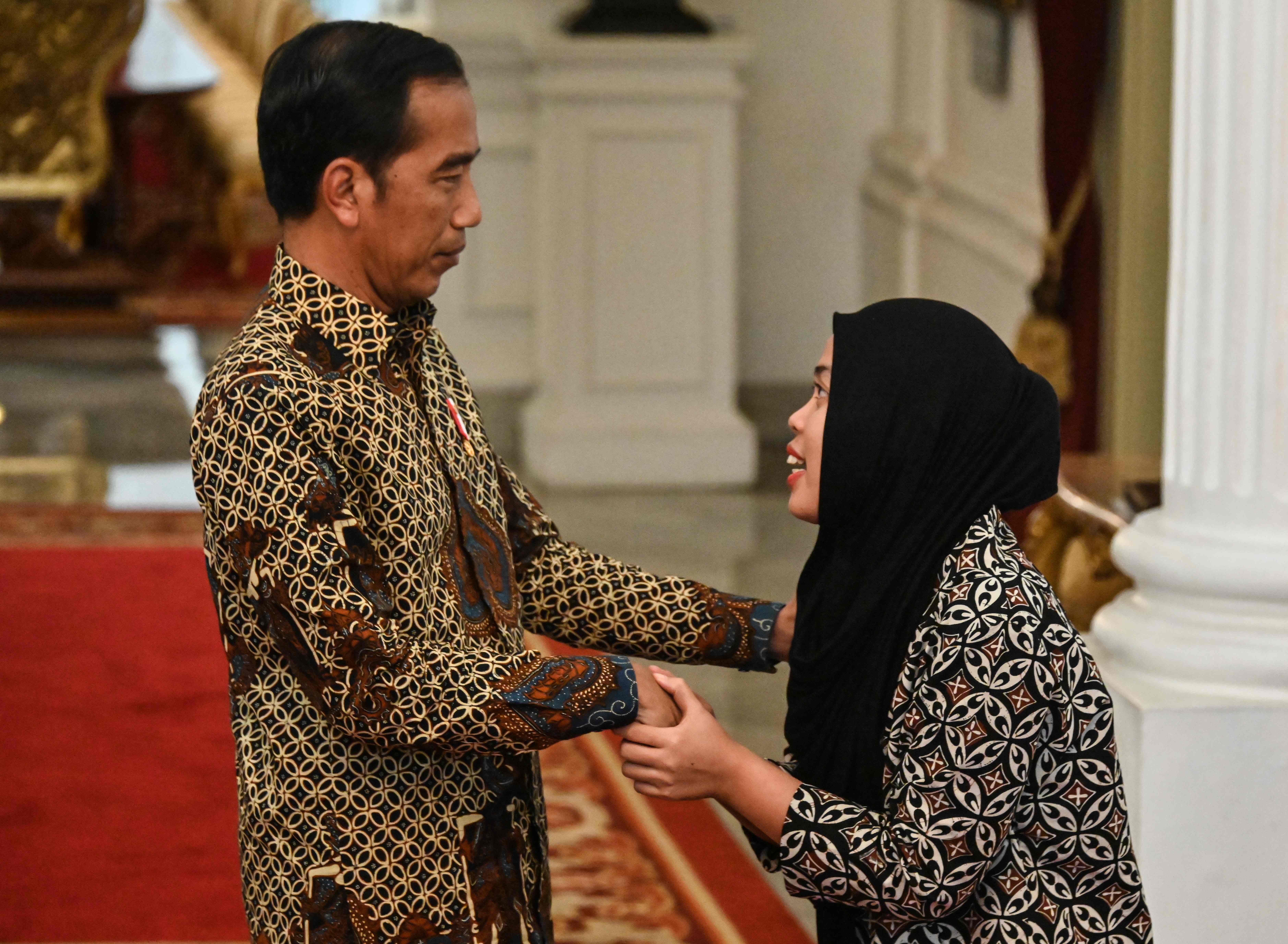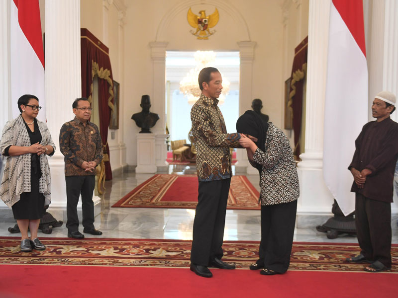 MATA Siti Aisyah tampak berkaca-kaca saat menghampiri Presiden Joko Widodo di Ruang Credential Istana Merdeka, Jakarta, kemarin.