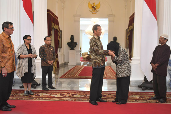 Siti Aisyah, warga negara Indonesia yang baru bebas dari ancaman hukuman mati di Malaysia menemui Presiden Joko Widodo di Istana Merdeka, Selasa (12/3).