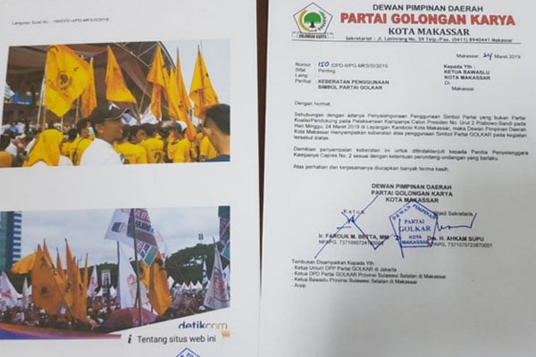 Surat ke Bawaslu itu ditandatangani Ketua Golkar Makassar Farouk M Betta dan Wakil Sekretarisnya, Ahkam Supu.