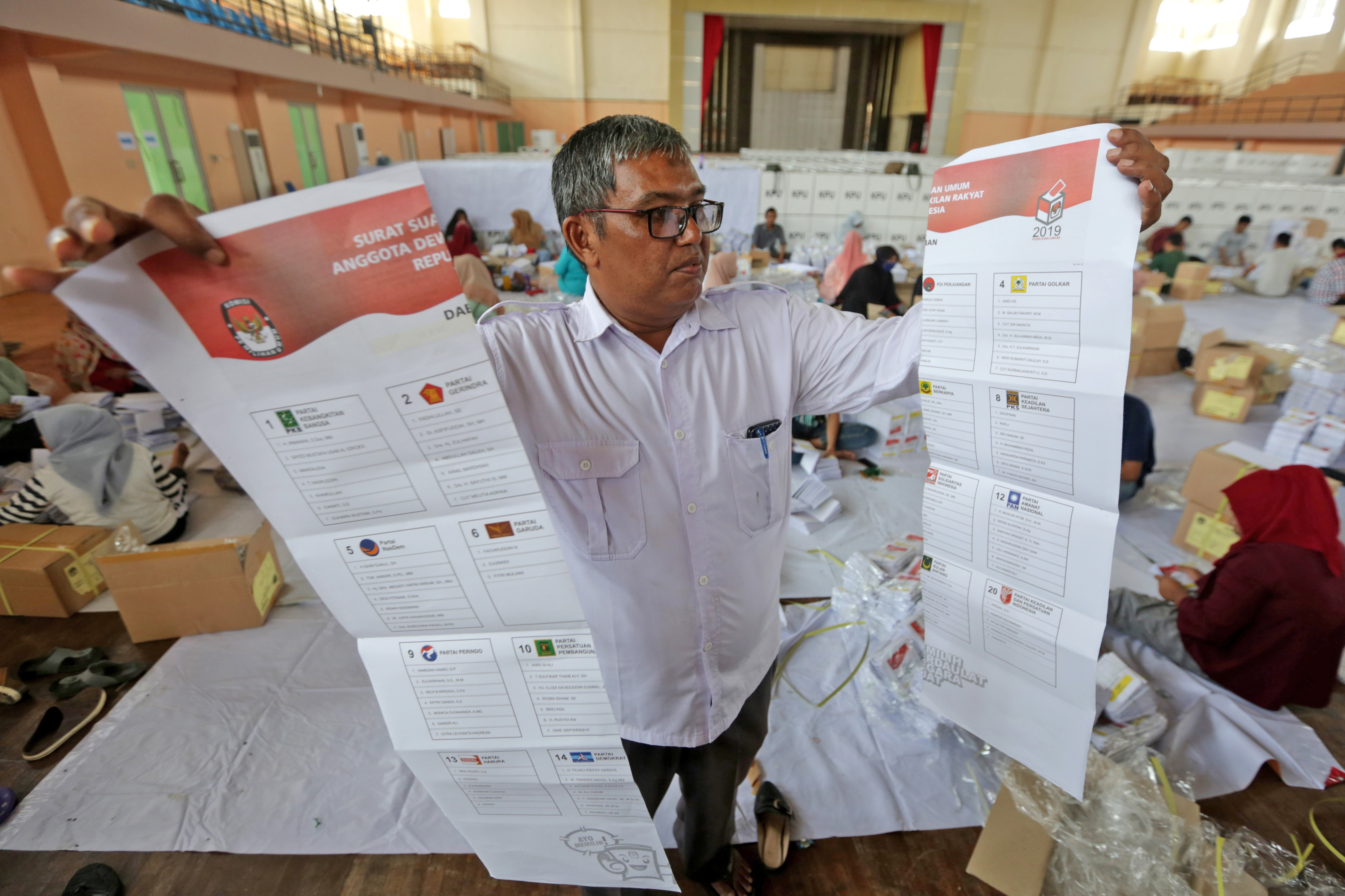 Penyortiran dan pelipatan lima jenis surat suara Pemilu melibatkan 2.500 pekerja harian lepas. Masing-masing kelompok jenis surat suara terdiri dari 500 orang.