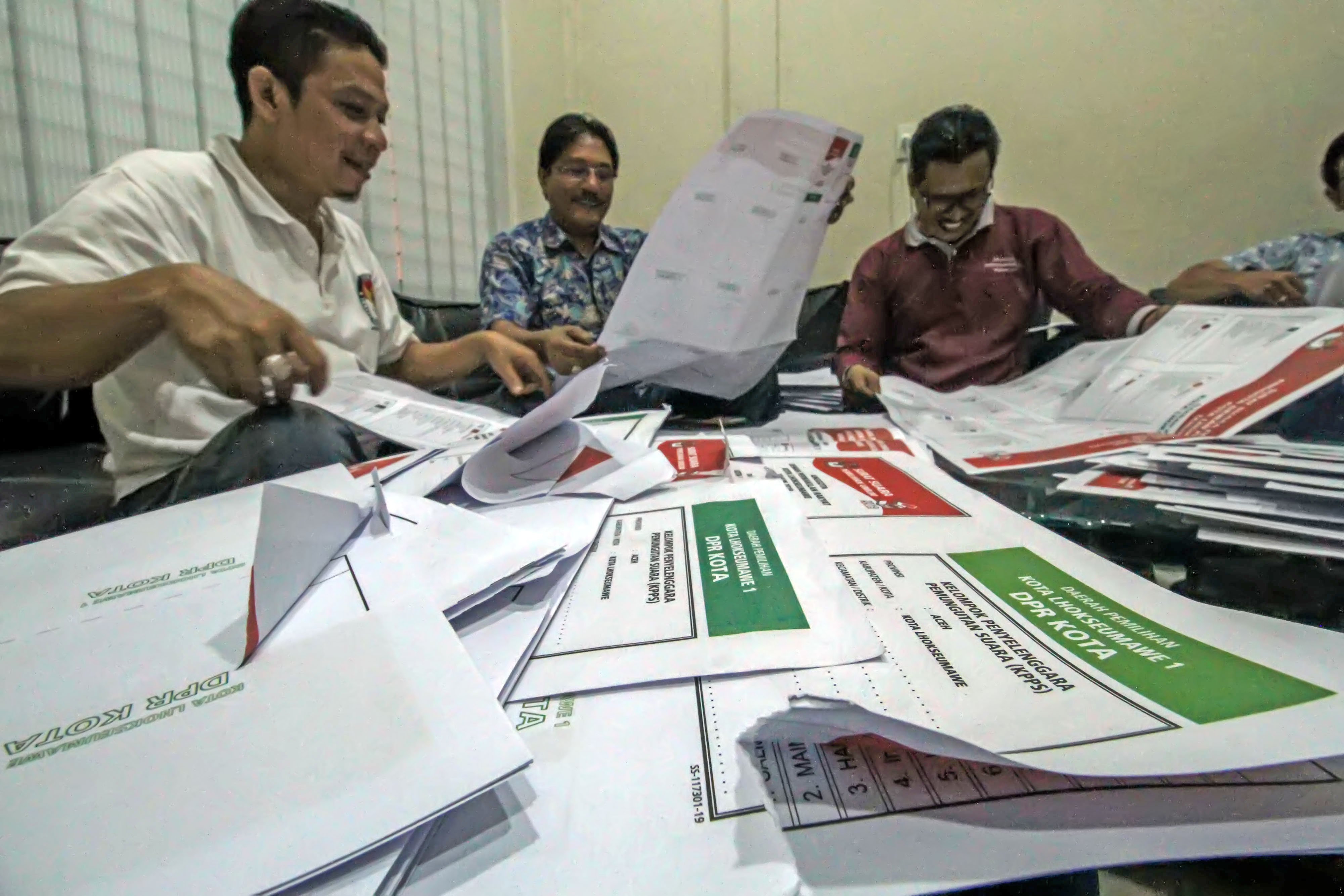 KPU sejumlah daerah telah menyortir dan melipat surat suara. Hingga saat ini, masih ditemukan surat suara robek, cetakan tidak ada, dan tidak sesuai.