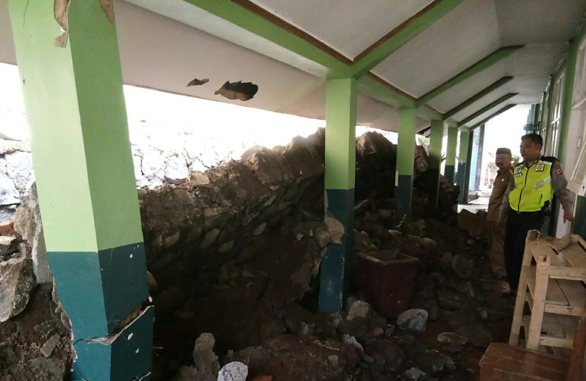 Berdasarkan informasi dihimpun, pergerakan tanah yang mengancam sejumlah bangunan rumah termasuk satu bangunan sekolah dasar tersebut terjadi usai dalam sepekan terakhir wilayah Cidaun diguyur hujan deras.