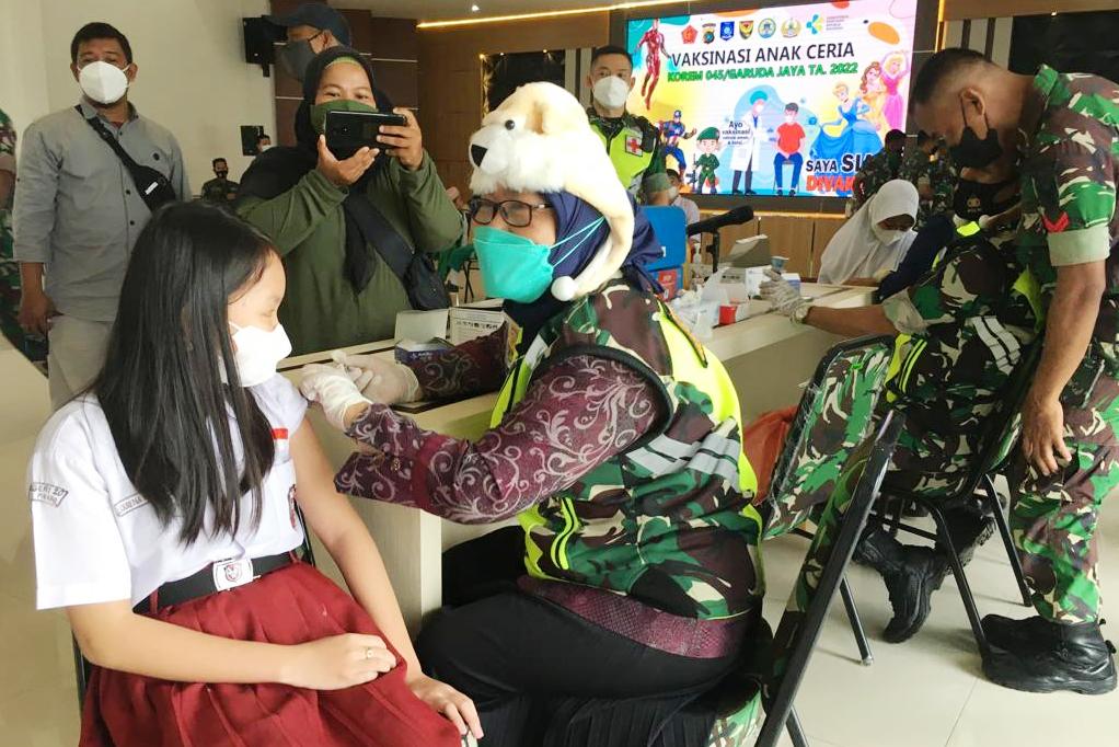 Yang menarik dari kegiatan vaksinasi itu, para tenaga kesehatan dari Korem 045/Gaya mengenakan atribut boneka.