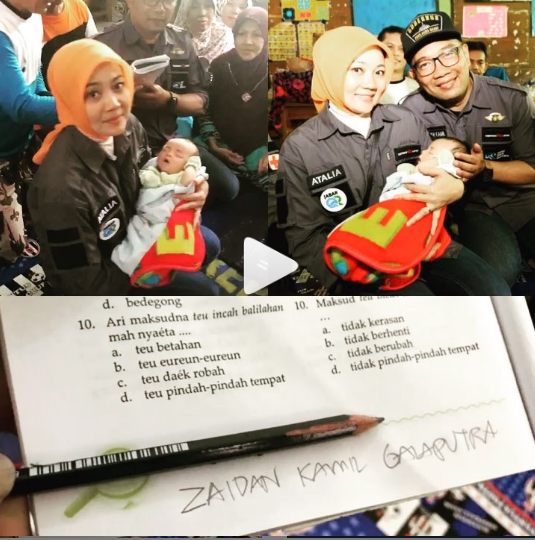 GUBERNUR Jawa Barat Ridwan Kamil, 47, dibuat kaget saat mengunjungi lokasi pengungsian korban bencana tsunami Selat Sunda di Kabupaten Pandeglang, Kamis (27/12). Kedatangannya bersama sang istri, Atalia Praratya, 45, itu rupanya menjadi berkah tersendiri bagi salah satu pengungsi.
