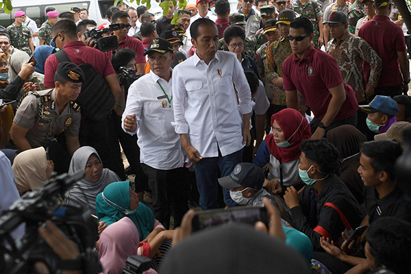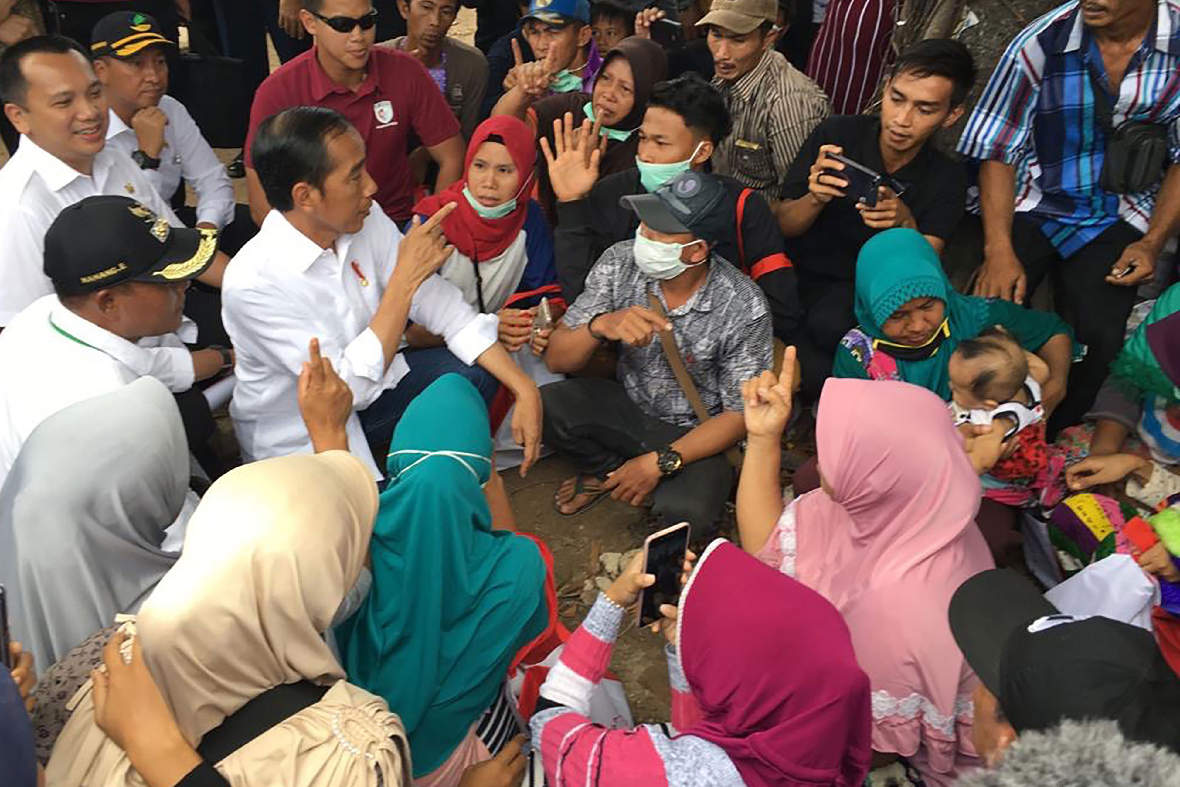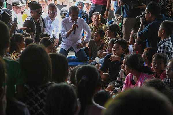 Presiden Joko Widodo (Jokowi) berdialog dengan para pengungsi dari Pulau Sebesi yang selamat dari bencana Tsunami Selat Sunda yang kini mengungsi di Lapangan Tenis Indoor Kalianda, Lampung Selatan.