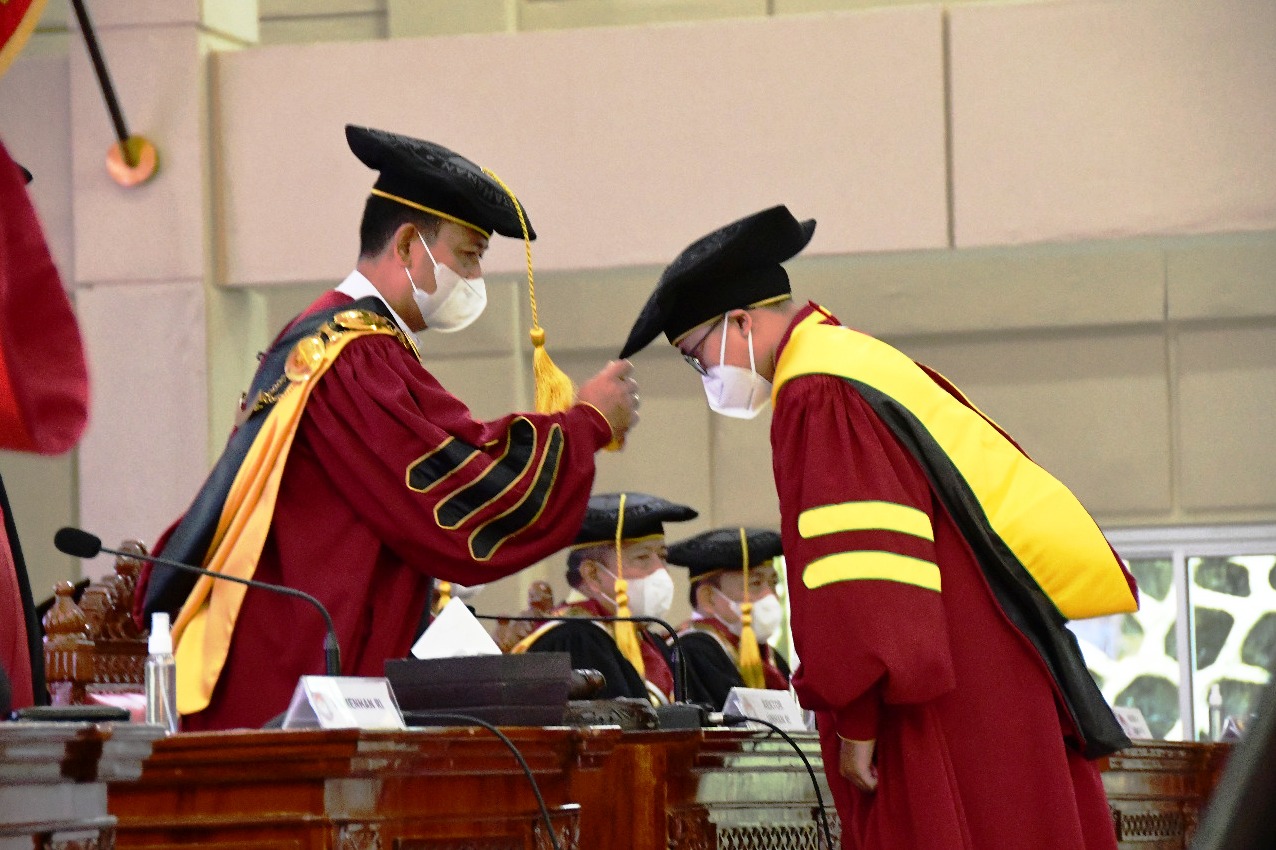 Eks Menteri Kesehatan Terawan Agus Putranto menyampaikan orasi ilmiahnya yang berjudul Peran Kesehatan Militer dalam Mendukung Ketahanan Kesehatan Nasional.